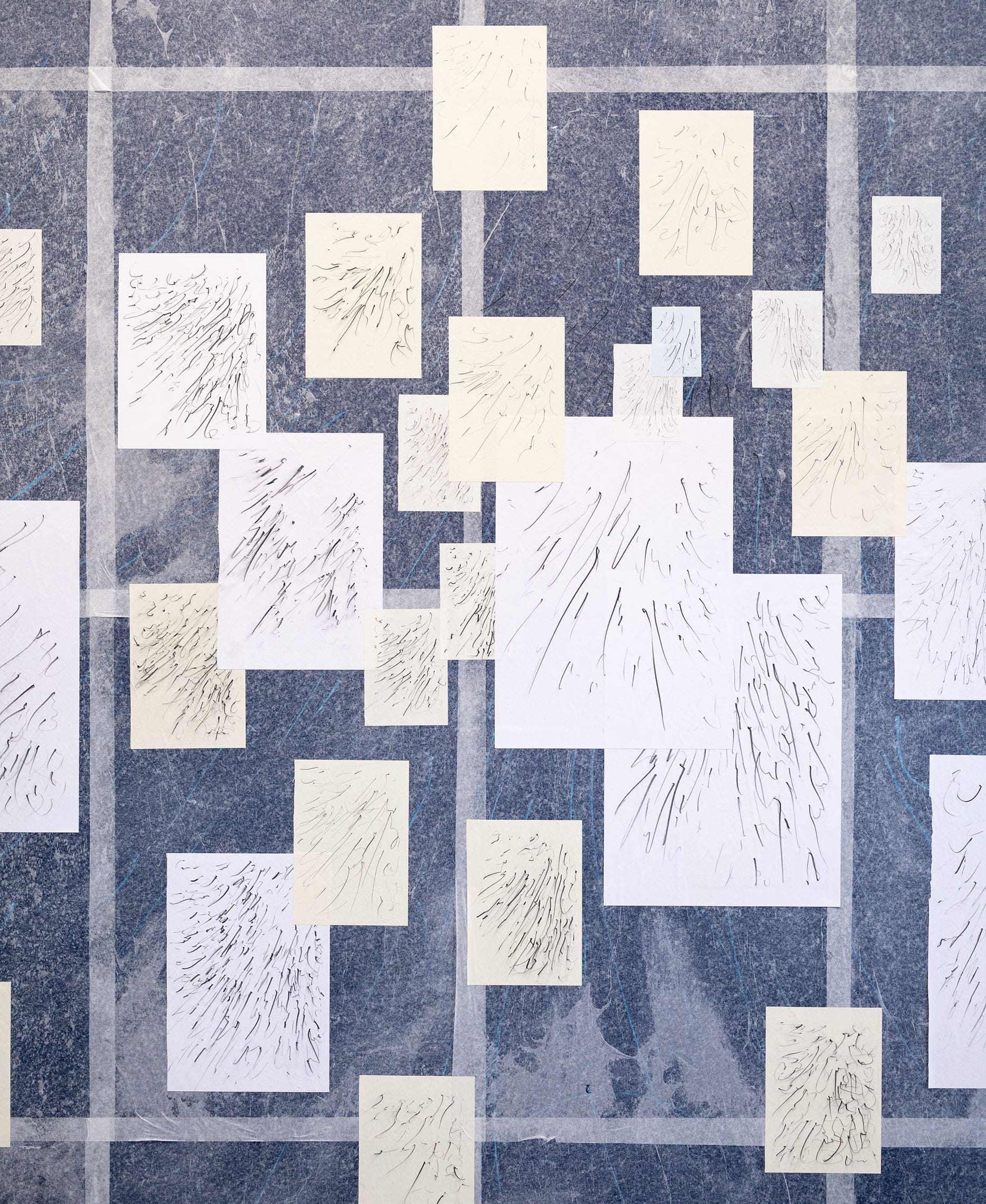 Attached you’ll find some photos of a recent panel that brings together a selection of ‘Aantekeningen’ (or, Annotations on excitation); collected from various notebooks I've been carrying over the past year. By arranging them in relation to each other’s appearance I aimed to create an emergent form of drawing. A larger field, or pattern-like structure that arises collectively from the lines on the separate pages.
